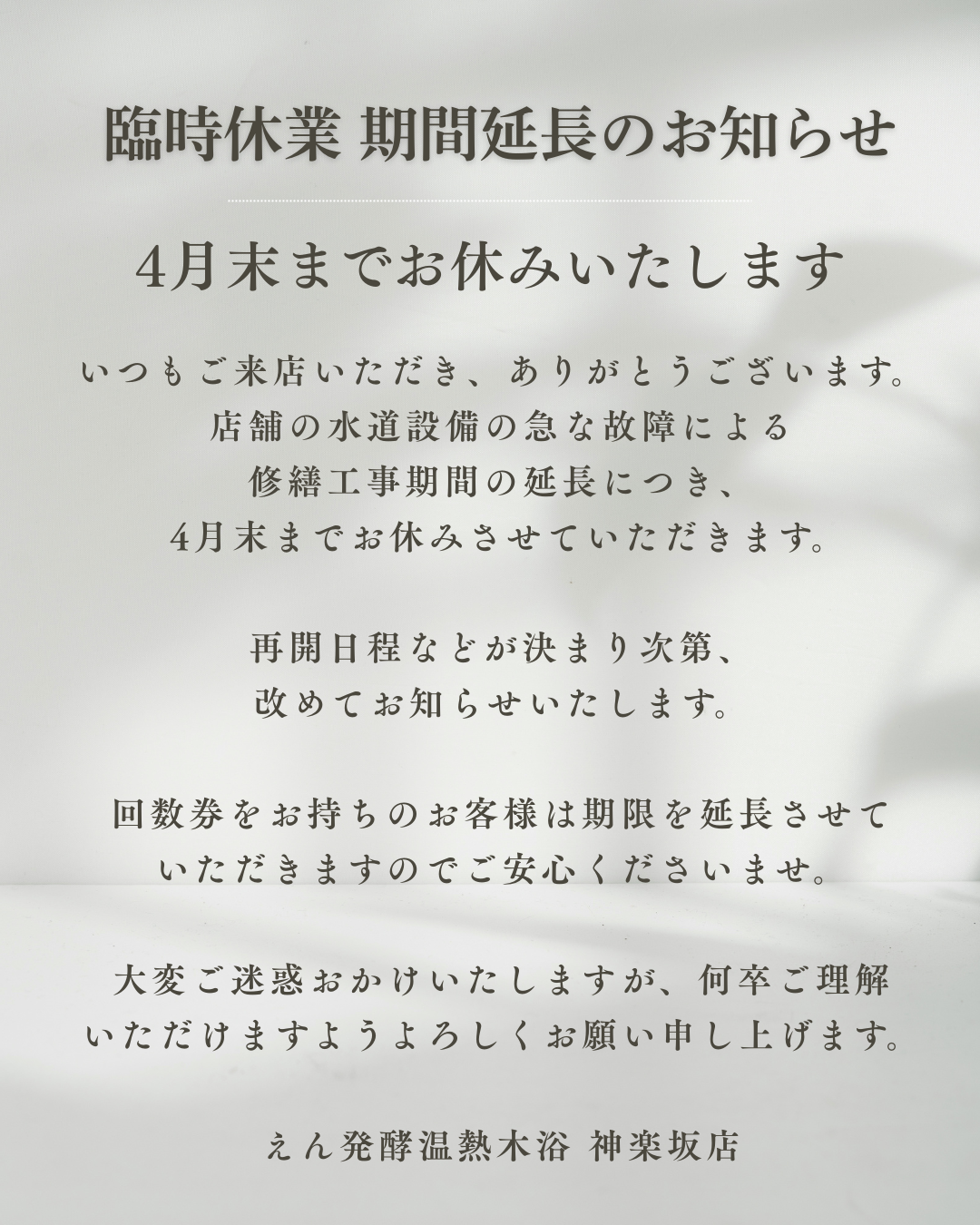この度、店舗の水道設備の故障に伴う修繕工事の延長により、臨時休業期間を延長させていただくこととなりました。